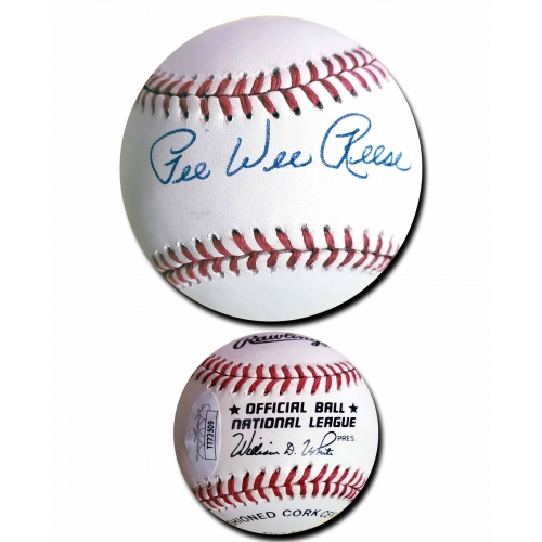 This National League Baseball is autographed by Dodgers Hall of Famer Pee Wee Reese and authenticated by James Spence Authentication (JSA). Certificates of Authenticity from JSA and Authentic Memories Sports & Entertainment Memorabilia will be included.