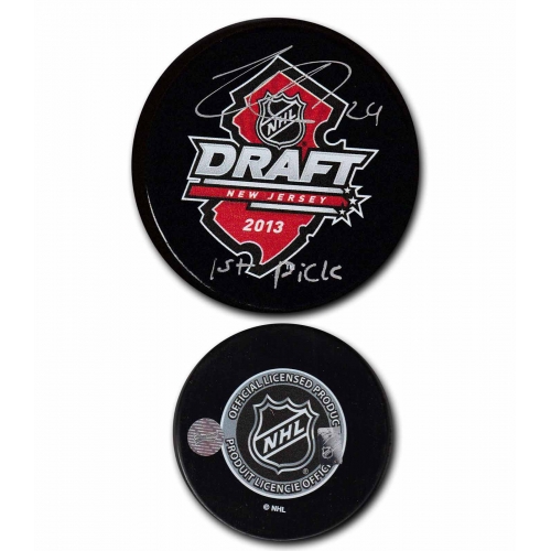 This 2013 NHL Draft Day hockey puck is autographed by former 1st overall pick Nathan McKinnon and authenticated by James Spence Authentication (JSA). The puck has the Frameworth hologram affixed to the backside and comes with Certificates of Authenticity from JSA and Authentic Memories Sports & Entertainment Memorabilia.